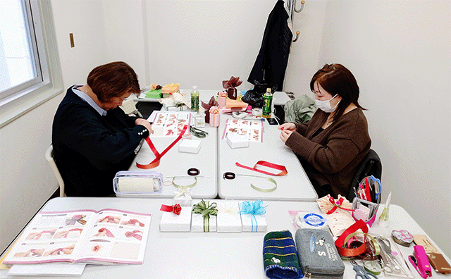 ▲コーディネート中級クラスの楽しみのひとつ、ローズリボンの製作中。