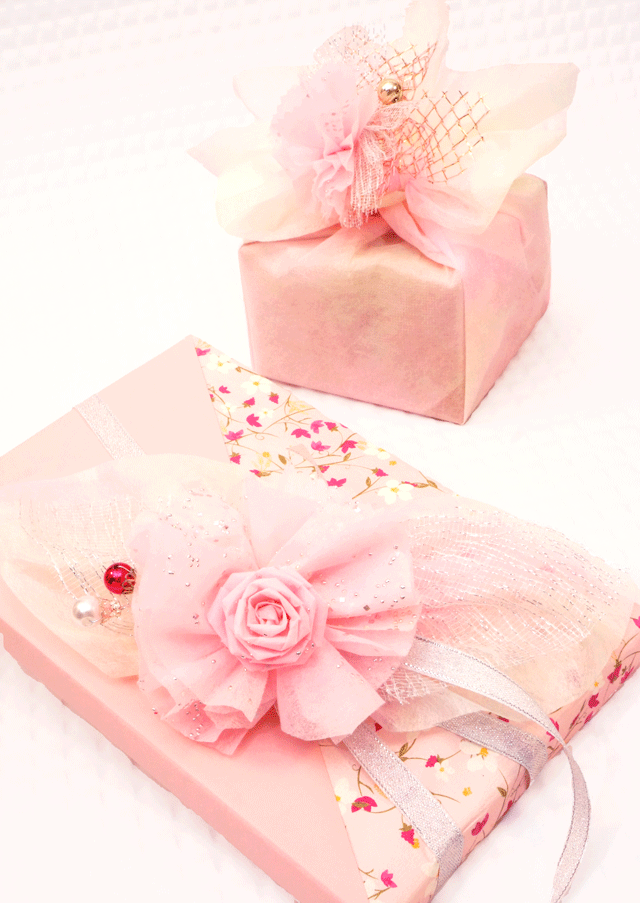 不織布やペーパーを用いた包みに、かわいさ満点の可愛さ抜群な自作のフラワーオーナメントをつけてみます!